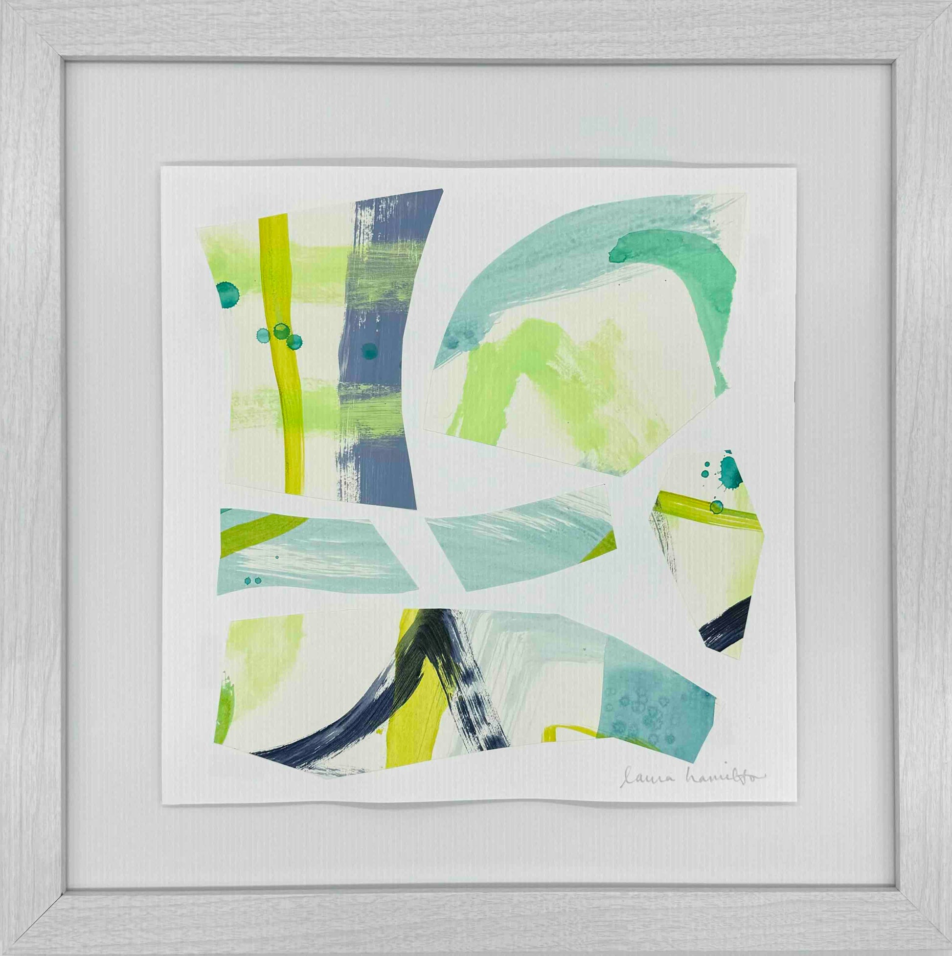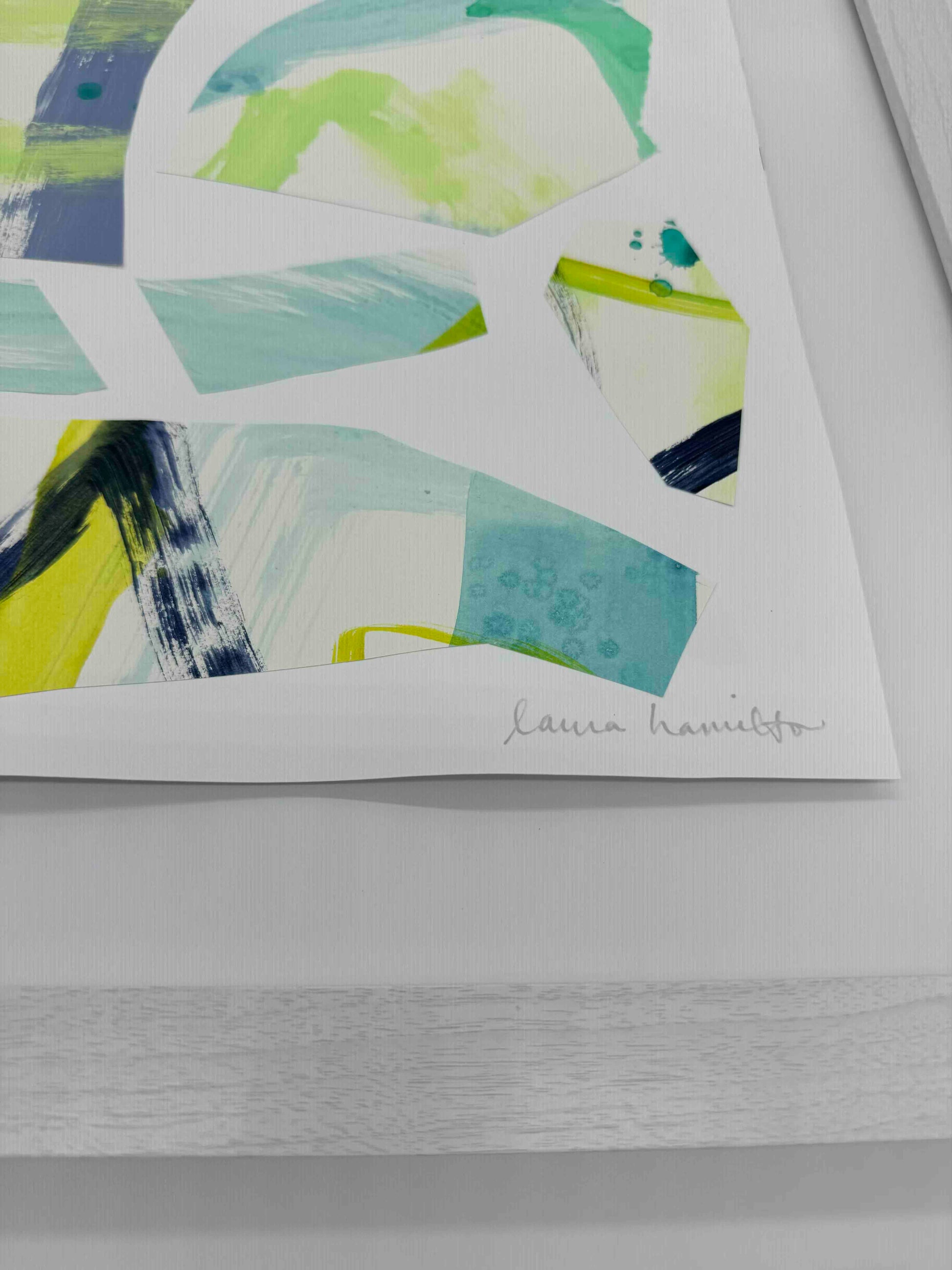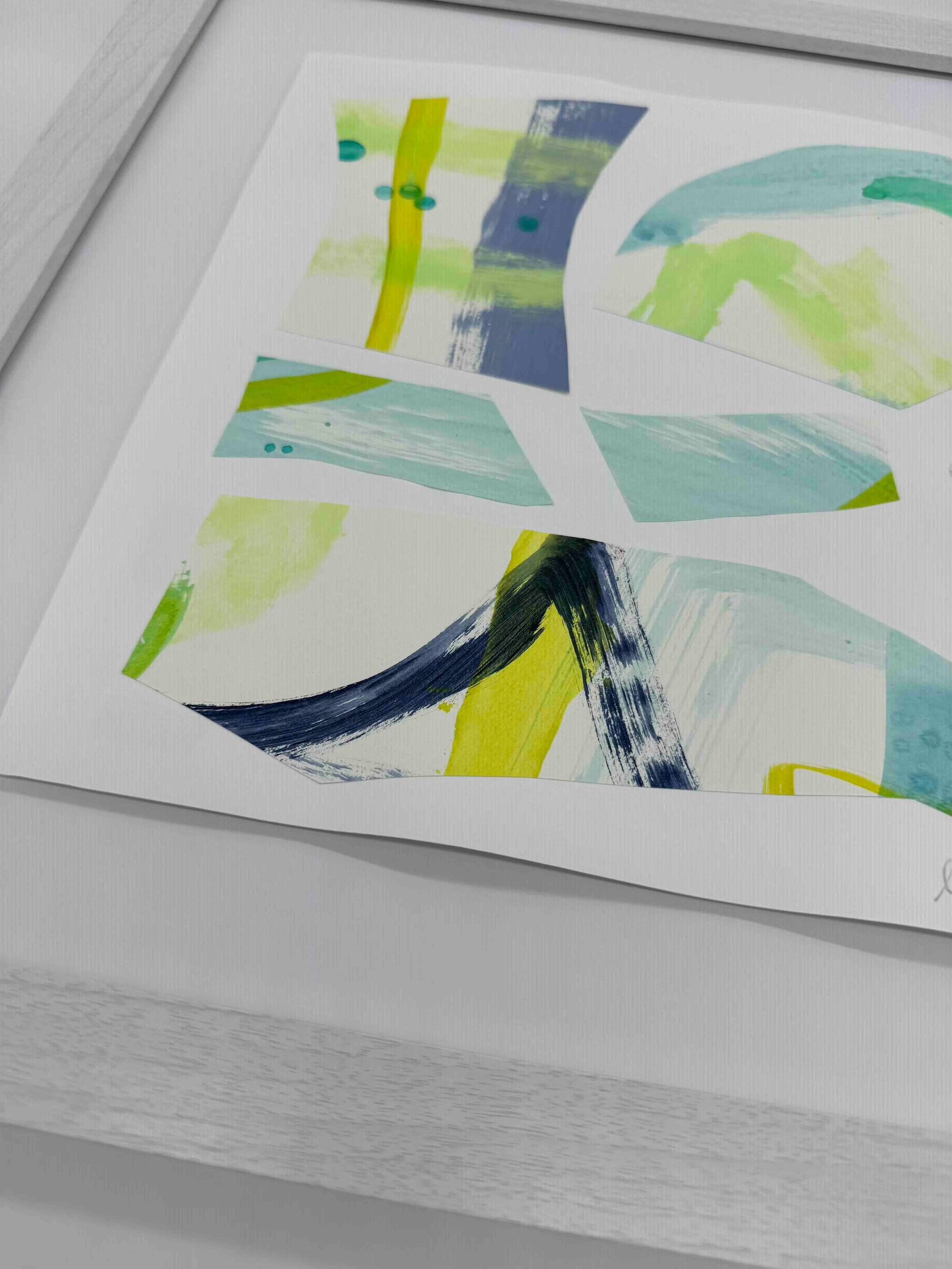 Framed original art by Laura Hamilton. Handmade collage made with acrylic painted watercolor paper. Artwork floating on white matting and framed under glass in a whitewashed wood frame. Artwork 12" x 12" for a total of 16" x 16" with the frame. 15% of all sales goes to those who suffer from mental illness find health and happiness.