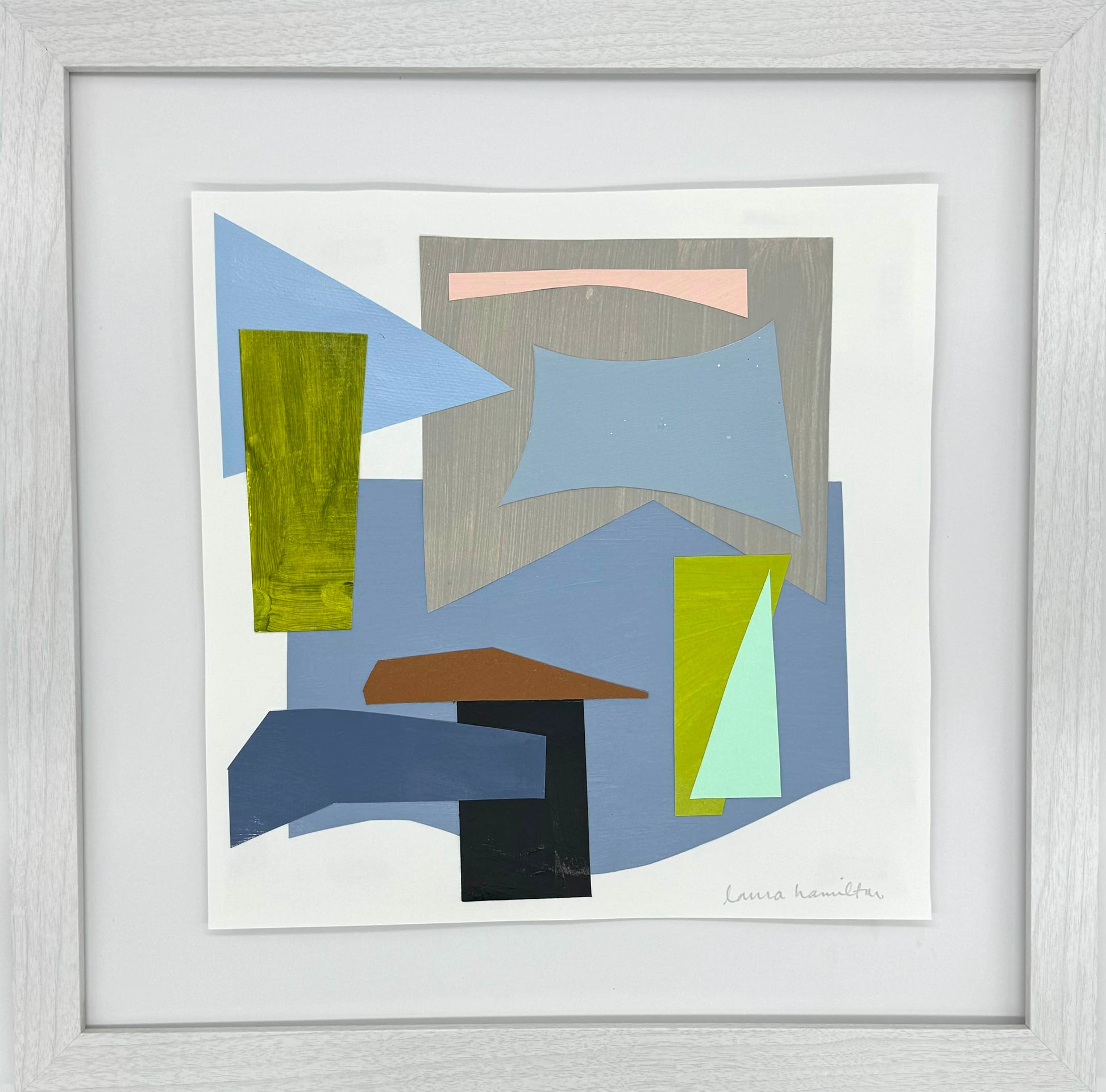 Framed original art by Laura Hamilton. Handmade collage made with acrylic painted watercolor paper. Artwork floating on white matting and framed under glass in a whitewashed wood frame. Artwork 12" x 12" for a total of 16" x 16" with the frame. 15% of all sales goes to those who suffer from mental illness find health and happiness.
