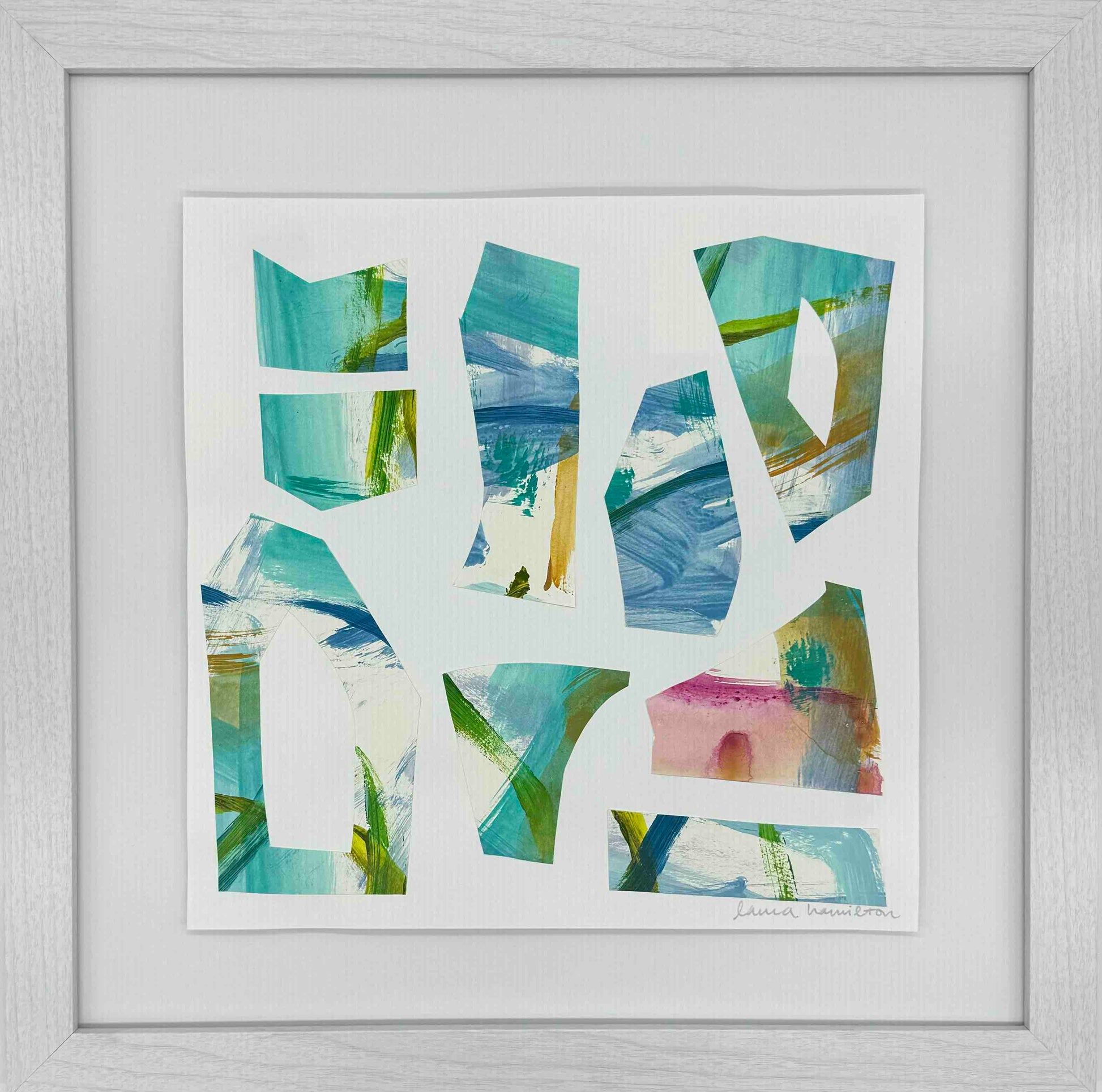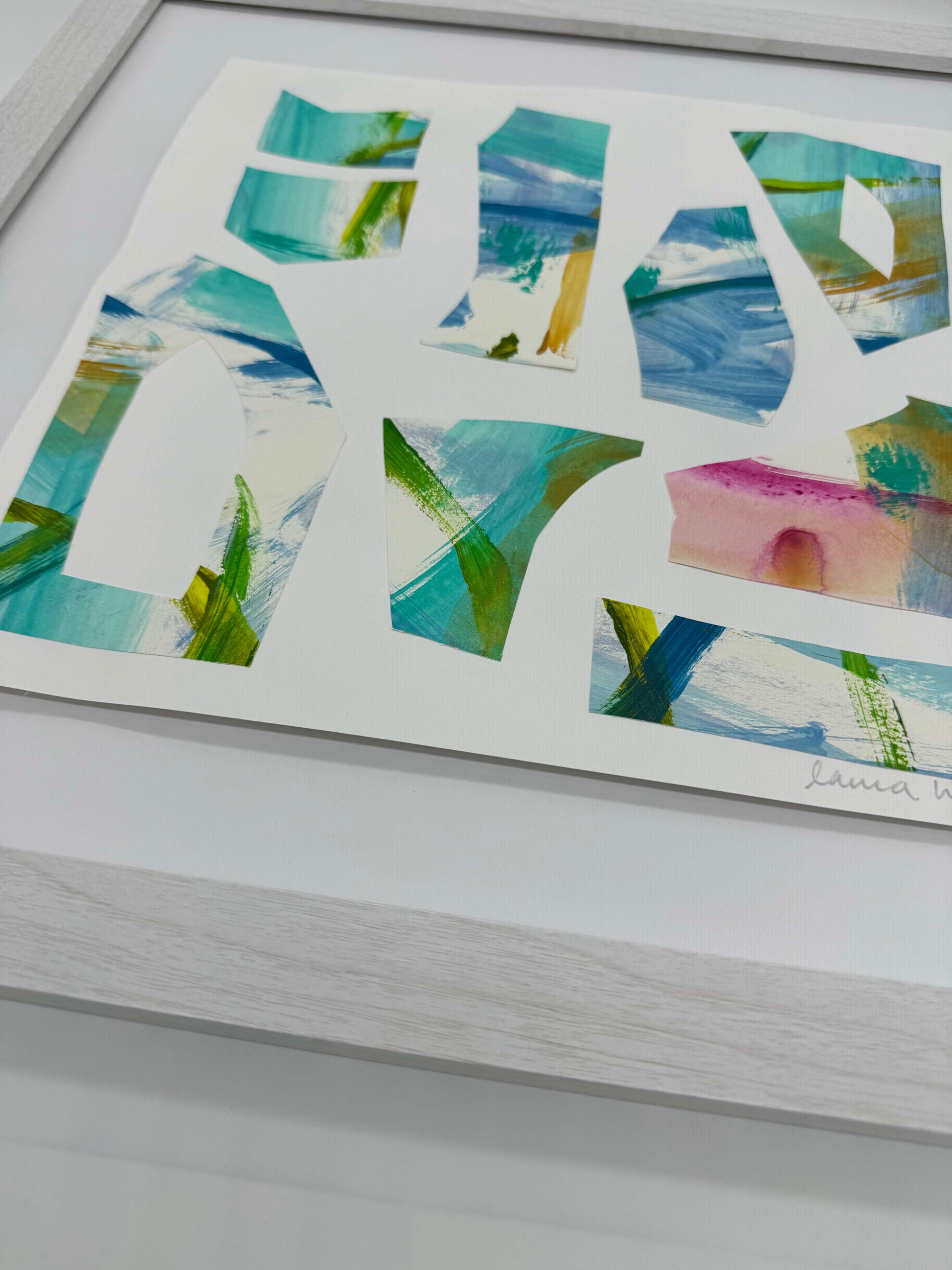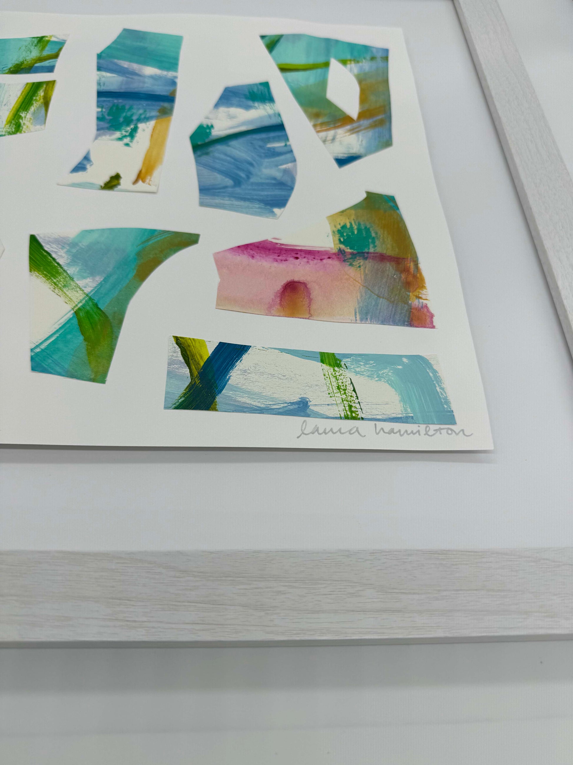Framed original art by Laura Hamilton. Handmade collage made with acrylic painted watercolor paper. Artwork floating on white matting and framed under glass in a whitewashed wood frame. Artwork 12" x 12" for a total of 16" x 16" with the frame. 15% of all sales goes to those who suffer from mental illness find health and happiness.
