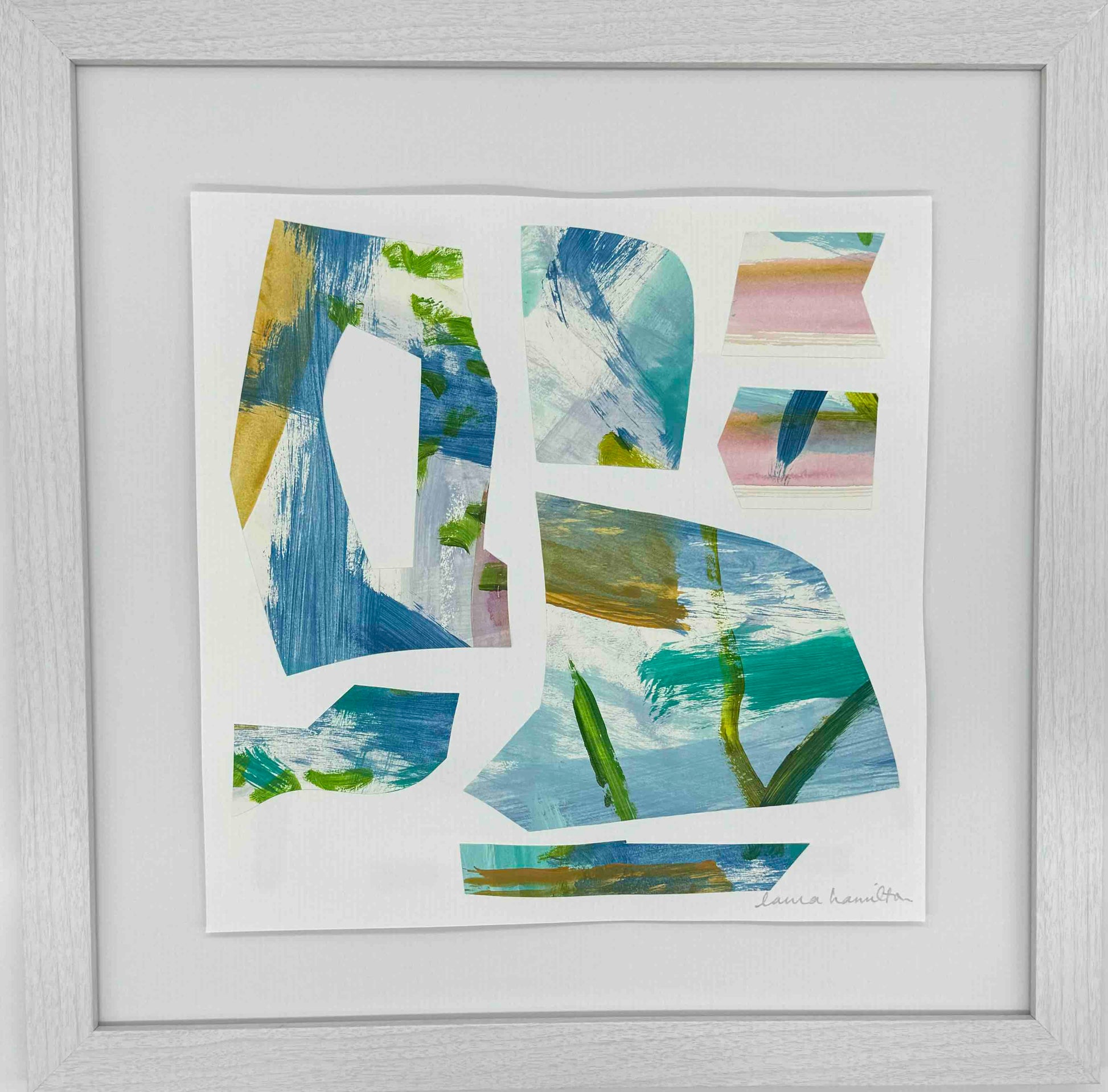 Framed original art by Laura Hamilton. Handmade collage made with acrylic painted watercolor paper. Artwork floating on white matting and framed under glass in a whitewashed wood frame. Artwork 12" x 12" for a total of 16" x 16" with the frame. 15% of all sales goes to those who suffer from mental illness find health and happiness.